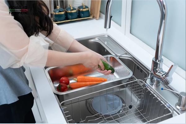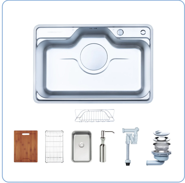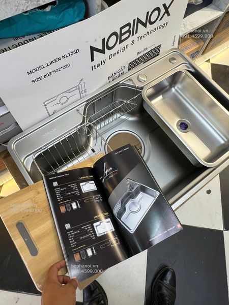 CHẬU RỬA BÁT 1 HỐ NOBINOX LIKEN NL725D siêu tiện lợi, lựa chọn cao cấp 2025, ống thoát góc quay gập gọn, vân siêu mịn, chính hãng Nobinox